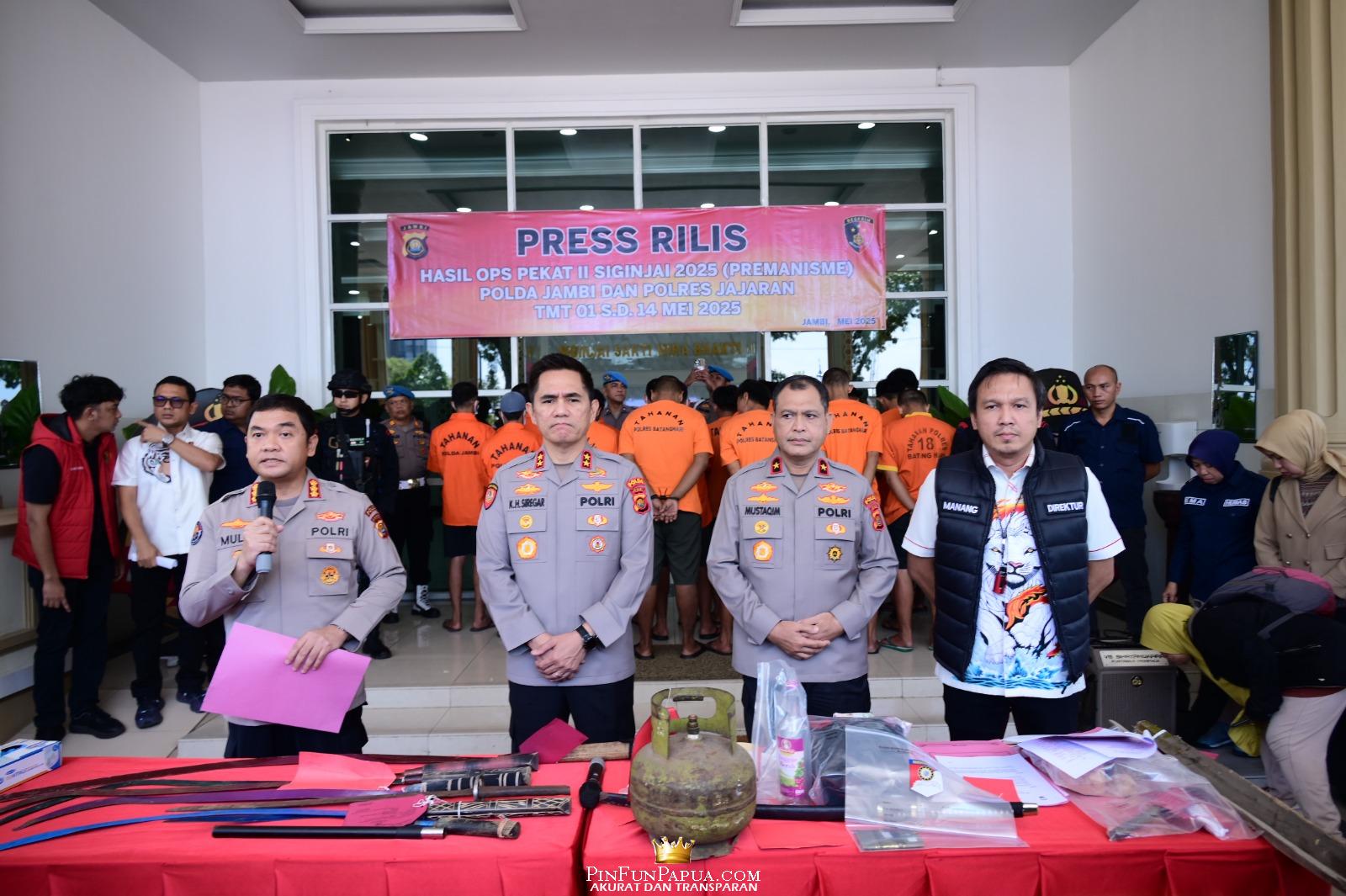 JAMBI, PinFunPapua.com – Kepolisian Daerah (Polda) Jambi bersama jajaran 10 Kepolisian Resor (Polres) berhasil mengamankan sebanyak 274 pelaku premanisme dalam pelaksanaan Operasi Penyakit Masyarakat (Pekat) Siginjai 2025. Operasi tersebut dilaksanakan selama 14 hari, terhitung sejak 1 hingga 14 Mei 2025.
