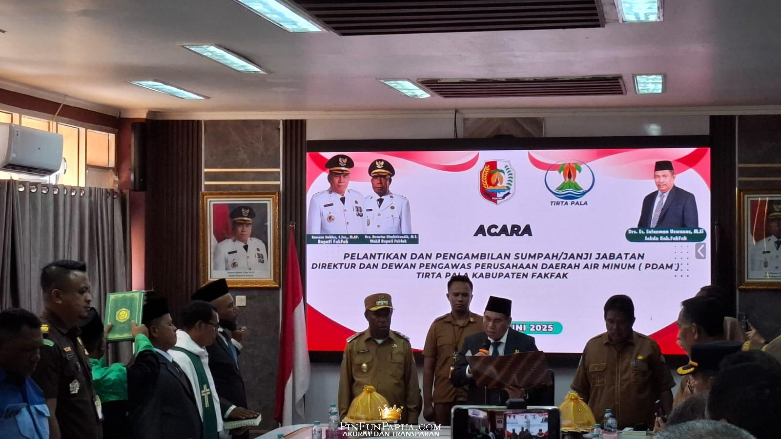 FAKFAK, PinFunPapua.com — Pemerintah Kabupaten Fakfak resmi melantik Irwan sebagai Direktur Perusahaan Daerah Air Minum (PDAM) Tirta Pala Kabupaten Fakfak, Papua Barat. Pelantikan dan pengambilan sumpah jabatan tersebut dilakukan langsung oleh Bupati Fakfak, Samaun Dahlan, dalam sebuah upacara yang digelar di Kantor Bupati Fakfak, Senin (16/6/2025).