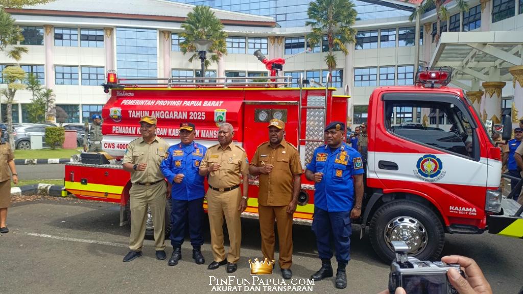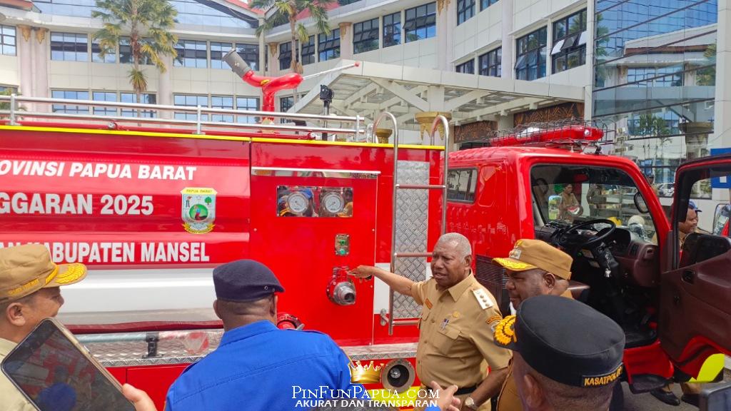 MANOKWARI, PinFunPapua.com — Pemerintah Provinsi Papua Barat menyerahkan satu unit mobil pemadam kebakaran kepada Pemerintah Kabupaten Manokwari Selatan sebagai upaya memperkuat kapasitas penanggulangan kebakaran di daerah tersebut. Serah terima kendaraan dilakukan langsung oleh Gubernur Papua Barat, Dominggus Mandacan, M.Si., kepada Bupati Manokwari Selatan, Bernard Mandacan, S.IP., di halaman Kantor Gubernur Papua Barat, Selasa (15/7/2025).