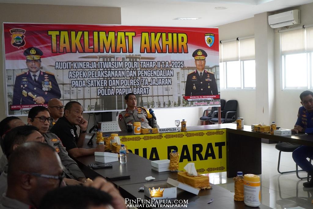 MANOKWARI, PinFunPapua.com – Kepolisian Daerah (Polda) Papua Barat menggelar Taklimat Akhir Audit Kinerja Tahap II Tahun Anggaran 2025 yang dilakukan oleh Tim Inspektorat Pengawasan Umum (Itwasum) Polri. Kegiatan tersebut dilangsungkan di Ruang Vicon Polda Papua Barat, pada Selasa, 16 Juli 2025, dengan diikuti oleh seluruh Kapolres dan pejabat utama Polda baik secara langsung maupun virtual.