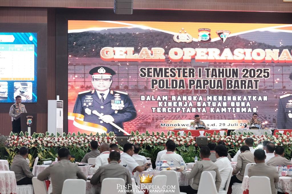 MANOKWARI, PinFunPapua.com – Dalam upaya meningkatkan kinerja satuan dan menciptakan situasi keamanan serta ketertiban masyarakat (kamtibmas) yang kondusif, Kepolisian Daerah (Polda) Papua Barat menggelar kegiatan Gelar Operasional Semester I Tahun 2025. Kegiatan strategis ini berlangsung selama dua hari, yakni pada Senin dan Selasa, 28–29 Juli 2025, di Gedung Arfak, Mapolda Papua Barat, Manokwari.