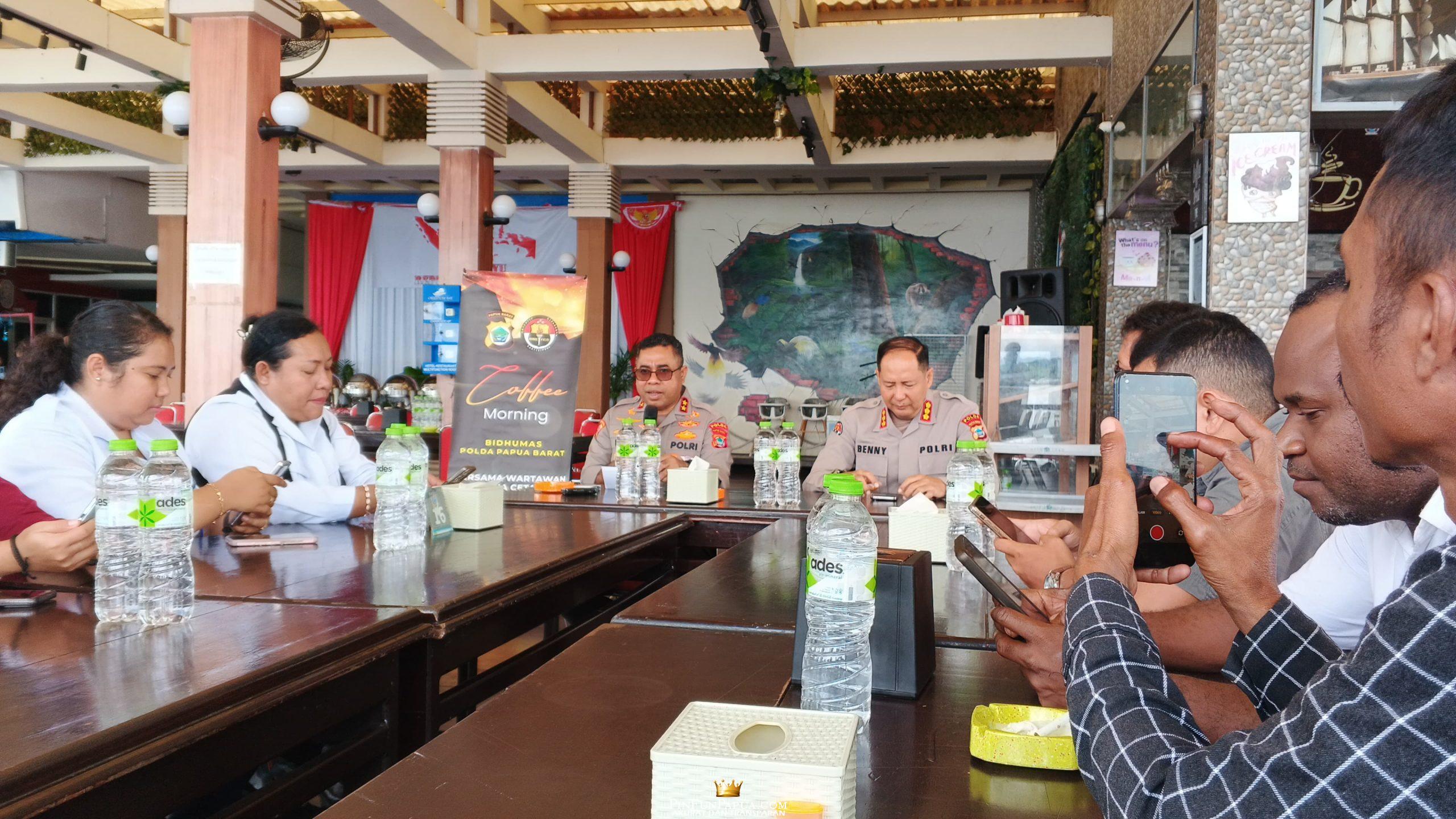 Kepolisian Daerah (Polda) Papua Barat menggelar Coffee Morning bersama insan pers Papua Barat sebagai upaya mempererat silaturahmi dan membangun sinergi dalam penyebaran informasi publik. Kegiatan tersebut berlangsung di Oriestom Bay Hotel Manokwari, Selasa (12/8/2025). (FOTO: JANU)
