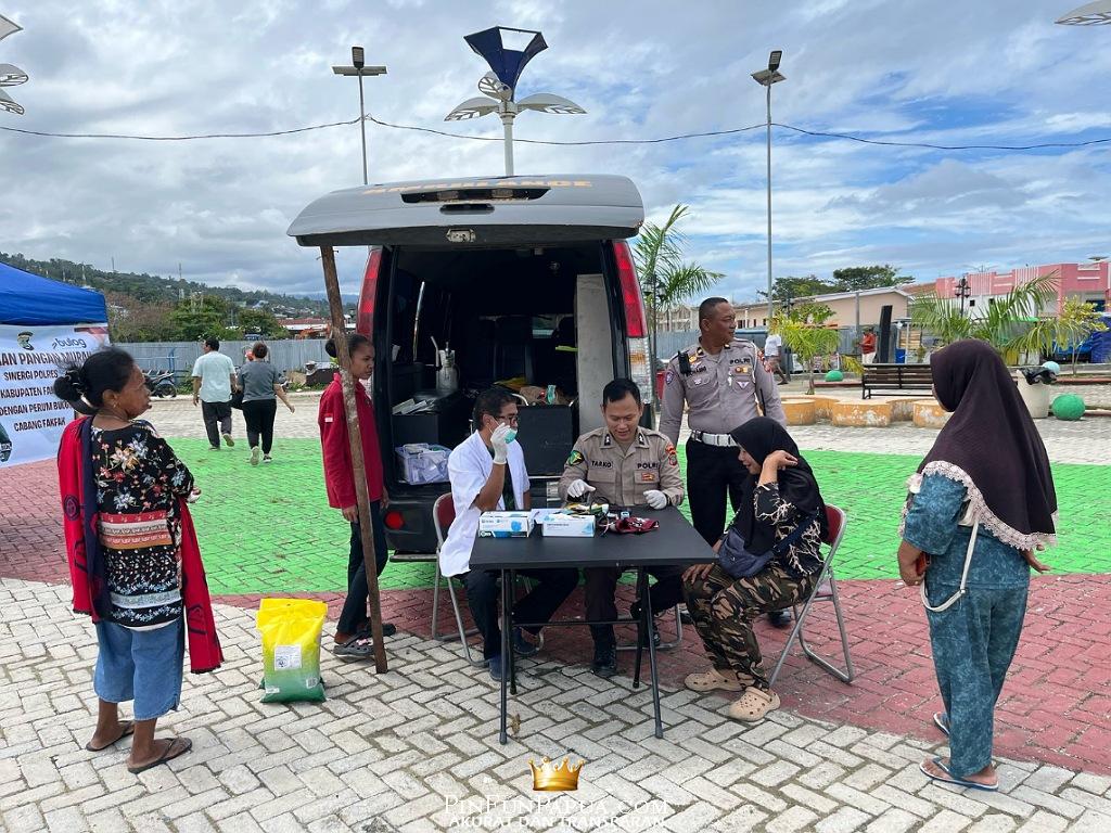 Selain menyediakan berbagai bahan pokok dengan harga terjangkau, Polres Fakfak juga membuka layanan kesehatan gratis melalui Mobil Klinik Polres Fakfak yang dipimpin langsung oleh dr. Indra Sully. Pemeriksaan kesehatan dan pengobatan ini menjadi bentuk nyata pelayanan langsung kepada masyarakat.
