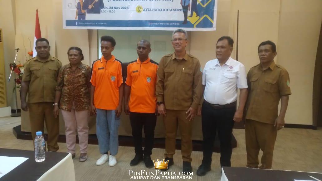 SORONG, PinFunPapua.com – Kepala Dinas Tenaga Kerja, Transmigrasi, Energi dan Sumber Daya Mineral (Disnakertrans & ESDM) Provinsi Papua Barat Daya, Suroso, S.IP., M.A., secara resmi membuka Kegiatan Pelayanan Antar Kerja Kabupaten/Kota melalui program pemagangan satpam yang dilaksanakan di Ayla Hotel, Jalan Srigunting, Kota Sorong, Papua Barat Daya. Pembukaan kegiatan ditandai dengan penabuhan tifa dan penyematan tanda peserta magang satuan pengamanan.
