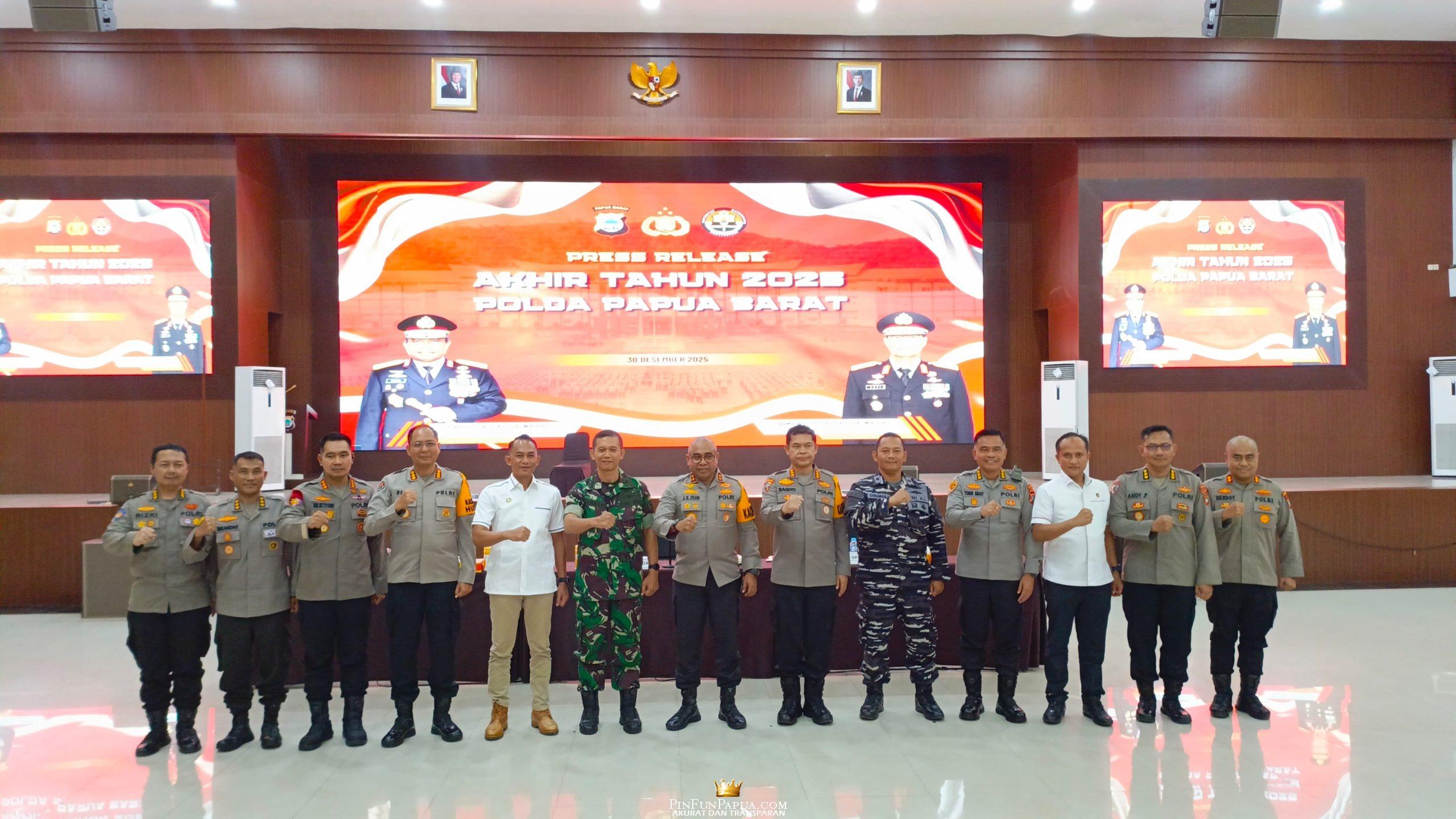 MANOKWARI, PinFunPapua.com — Kepolisian Daerah (Polda) Papua Barat menggelar rilis akhir tahun 2025 yang berlangsung di Gedung Arfak Confession Hall, Markas Polda Papua Barat, Selasa (30/12/2025). Kegiatan tersebut dipimpin langsung oleh Kapolda Papua Barat, Irjen Pol Jhonny Edison Isir, S.I.K., M.T.C.P., serta dihadiri unsur Forum Koordinasi Pimpinan Daerah (Forkopimda) Provinsi Papua Barat.