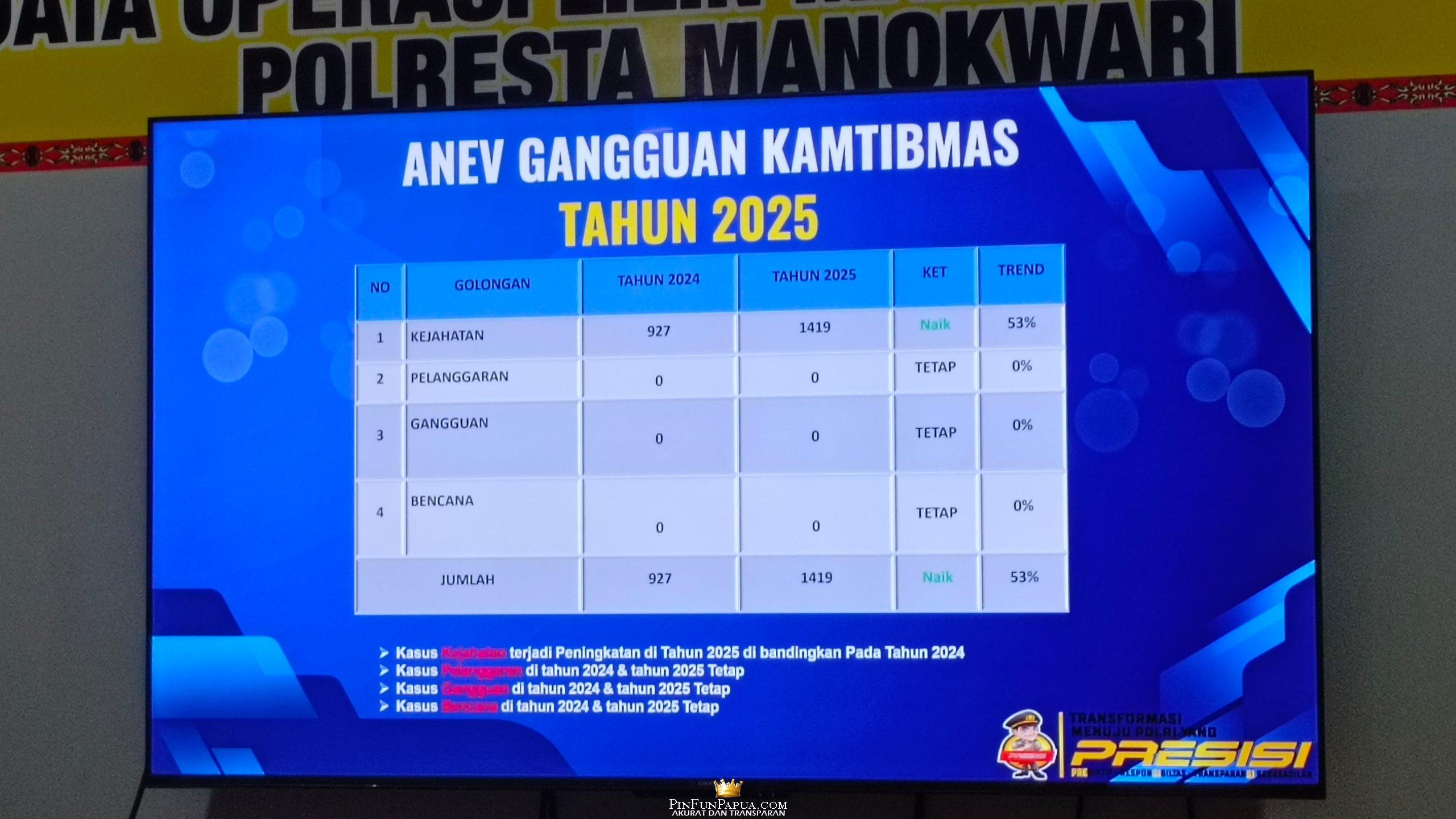 Dalam pemaparannya, Kapolresta Manokwari menyampaikan bahwa secara akumulatif angka kriminalitas di wilayah hukum Polresta Manokwari mengalami peningkatan yang cukup signifikan dibandingkan dengan tahun sebelumnya. Berdasarkan data Anev, total gangguan Kamtibmas pada tahun 2025 tercatat sebanyak 1.419 kasus, meningkat 53 persen dibandingkan tahun 2024 yang berjumlah 927 kasus.