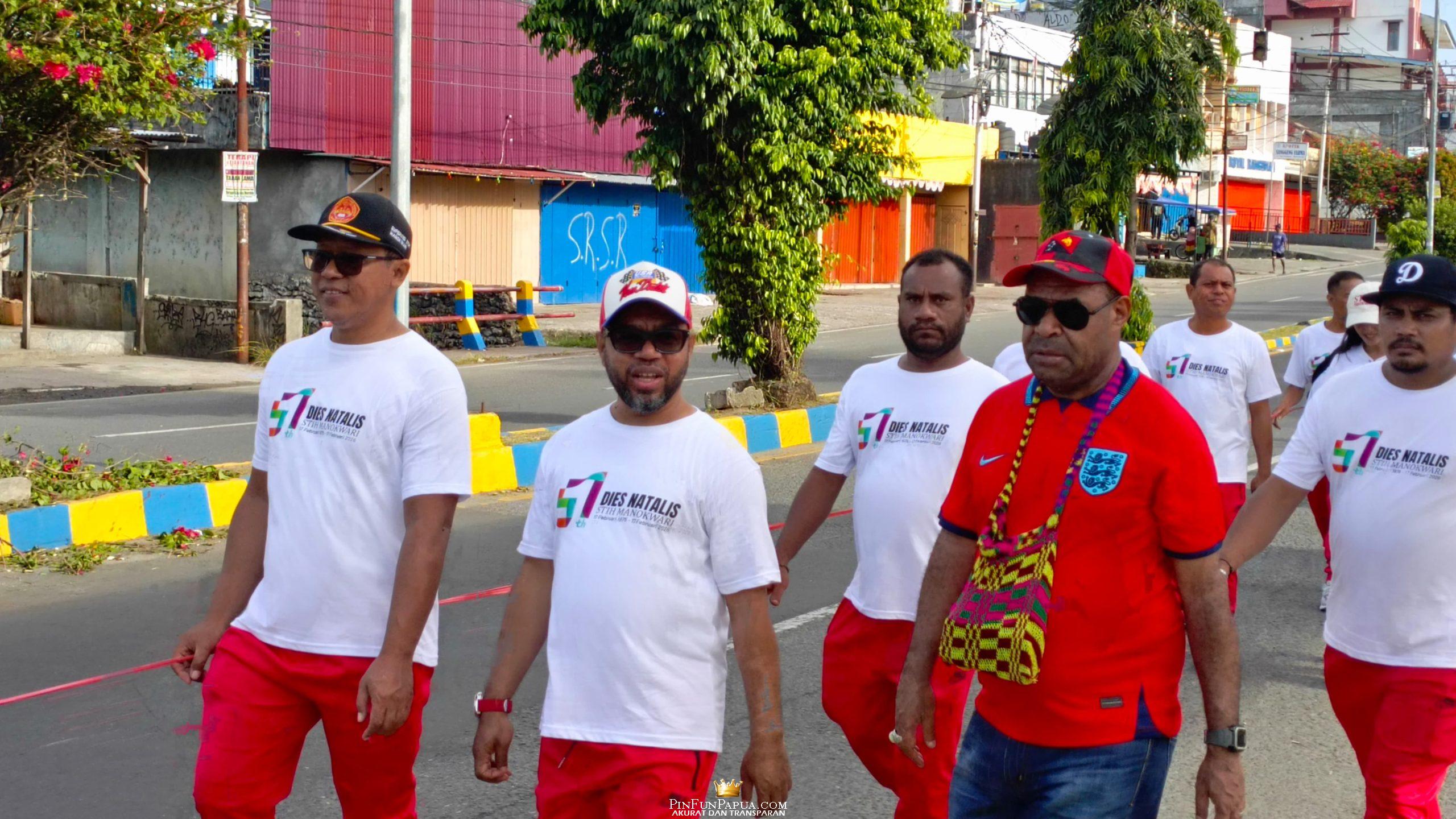 Ketua STIH Manokwari, Filep Wamafma, turut hadir dan berjalan bersama para peserta. Kehadiran pimpinan lembaga bersama seluruh elemen kampus mencerminkan semangat kebersamaan dan soliditas dalam menyongsong usia ke-51 tahun STIH Manokwari.